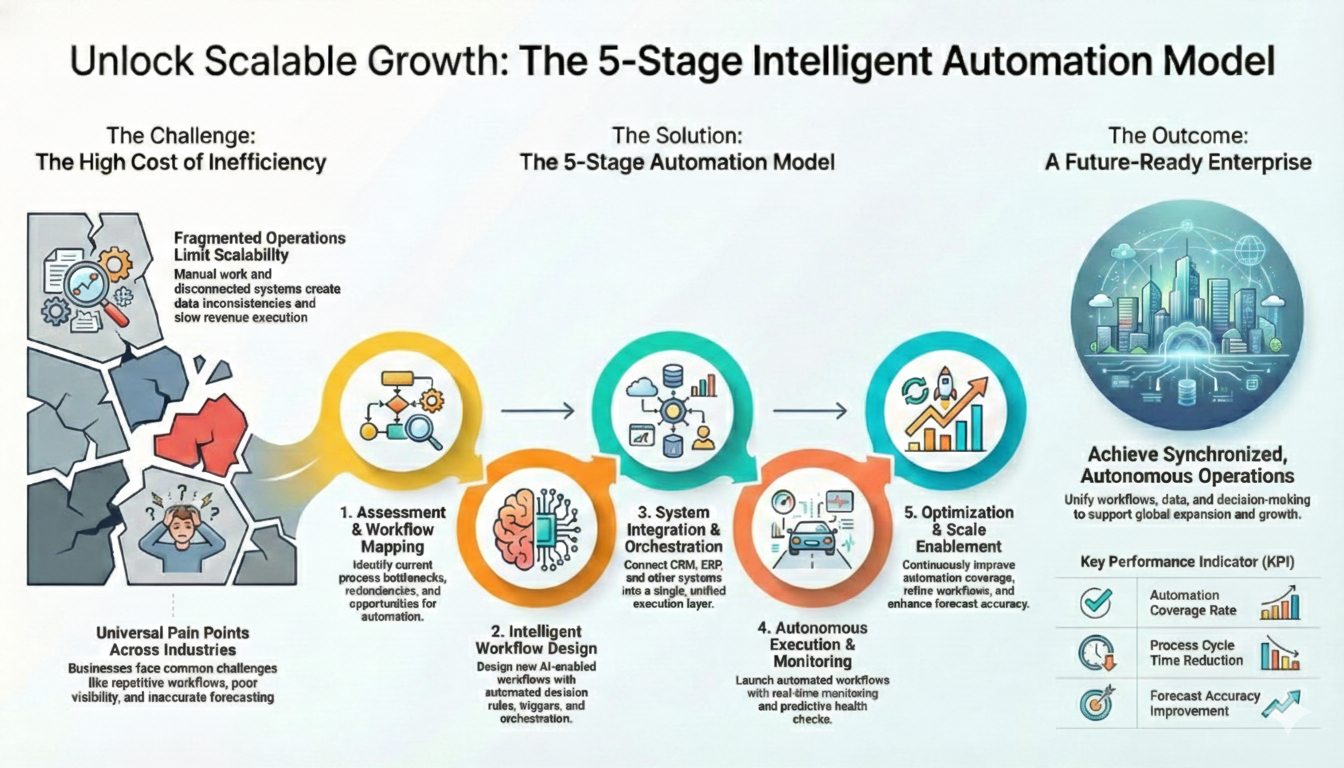 - Optimization & Scale Enablement: Continuous insights refine automation performance and support global-scale operational expansion.